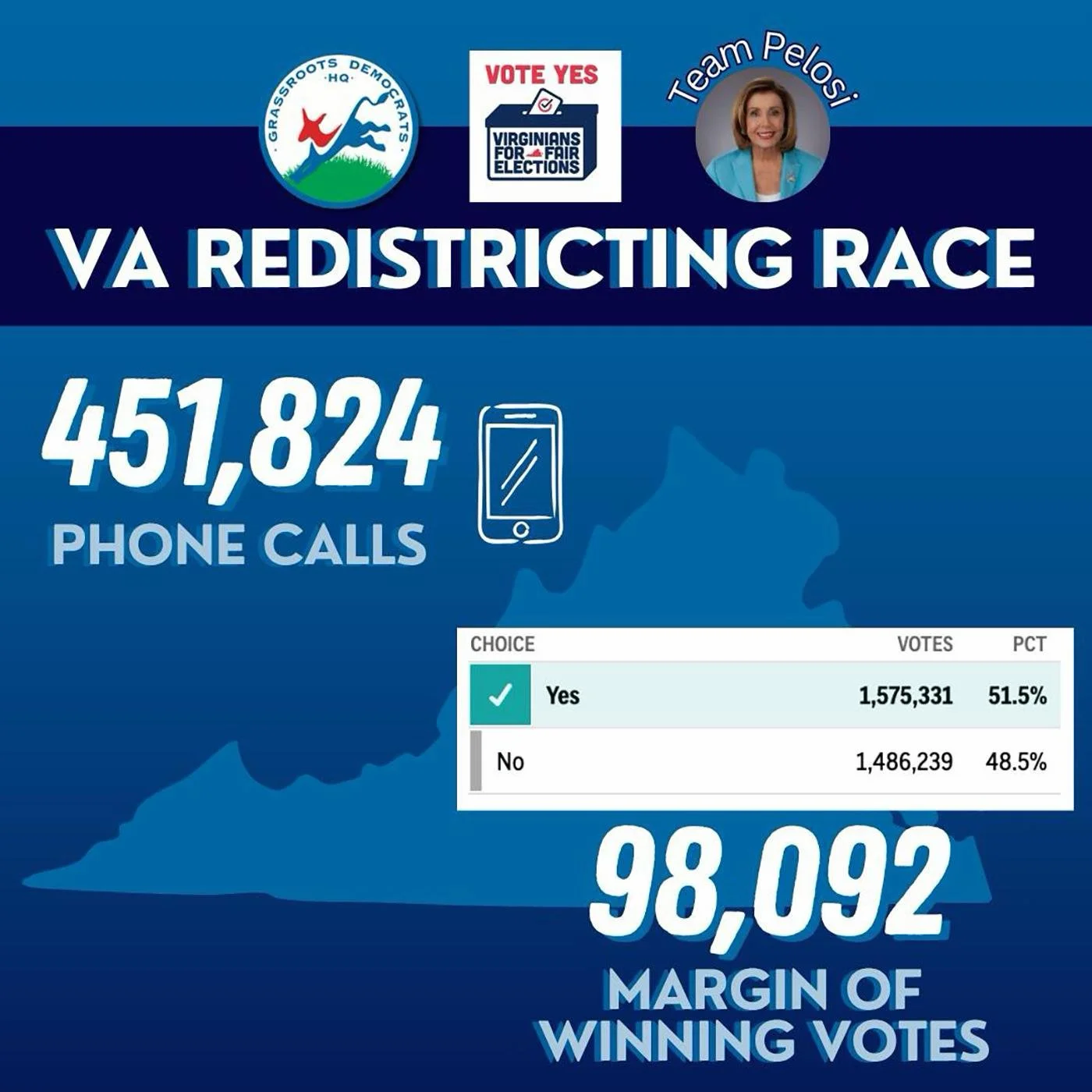 Congratulations to the YES campaign for this great victory for Virginia and our democracy. Democrats didn’t start this fight, but we are going to finish it.