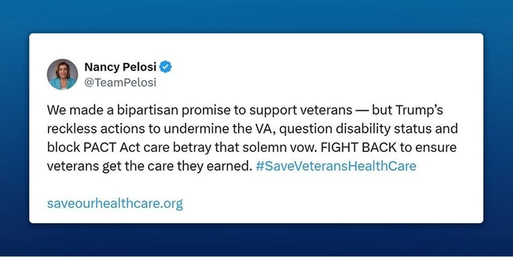 From Trump’s reckless hiring freeze that exacerbates understaffing at Veterans’ Affairs to his illegal federal aid freeze to firing the Veterans’ Affairs Inspector General, questioning disability benefits and attempting to block PACT Act cancer care benefits — Trump and Republicans are putting the health of veterans in jeopardy to give massive tax cuts to billionaires and big corporations.